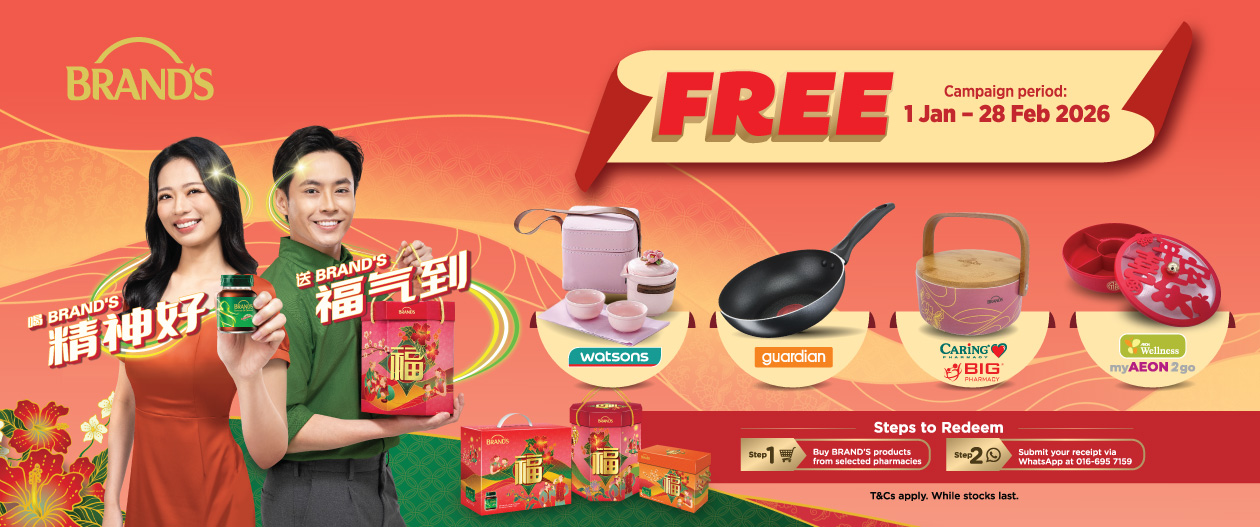 - Purchase any Brand’s® products worth RM238 / RM288* and above (in a single receipt, for any Brand’s® products and CNY Gifting Products) from any selected participating retailers nationwide during the Campaign Period.